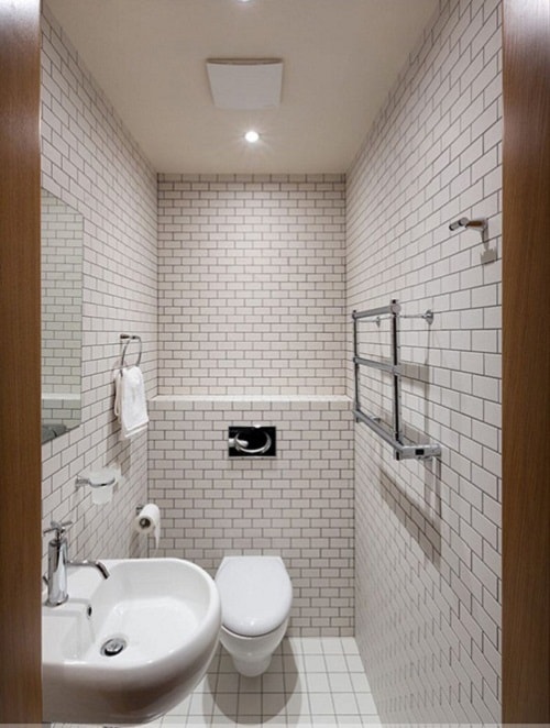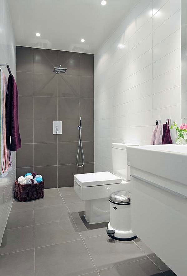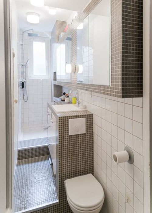 Để thiết kế nhà vệ sinh theo chiều dọc thì bạn phải tối giản hóa các thiết bị hết mức có thể. Lựa chọn thêm những loại gạch ô vuông nhỏ có gam màu tối để làm nổi bật và mang lại cảm giác sạch sẽ hơn.