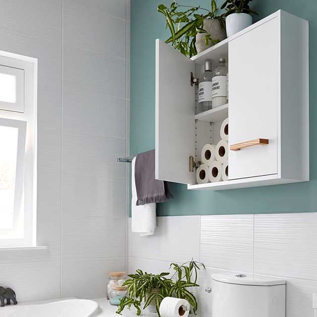 Chọn tủ âm tường màu trắng sau đó đặt ngay trên bồn cầu vệ sinh. Thiết kế gam màu xanh nổi bật để giúp tủ âm tường nổi bật hơn.