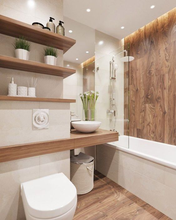 Kệ âm tường chất liệu gỗ sẽ khiến phòng vệ sinh nổi bật và sạch sẽ hơn rất nhiều. Có thể kết hợp chung với chậu rửa mặt để có được nhiều không gian chứa đồ hơn.