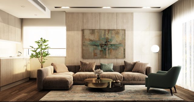 Đồ nội thất chính là “linh hồn” của phòng khách hiện đại. Một bộ Sofa da cao cấp với thiết kế đơn giản, tinh tế có chất liệu tuyệt hảo không chỉ mang lại cho gia chủ sự thư giãn tuyệt đỉnh. Nó còn là cách giúp gia chủ thể hiện đẳng cấp, cá tính và quyền lực của mình trong căn hộ. Sofa da kết hợp với bàn trà mặt đá nhân tạo gốc thạch anh mang lại sự sang trọng đầy lôi cuốn. Bên cạnh đó sự kết hợp hài hòa giữa các món đồ nội thất như kệ tivi, giá sách, tranh treo tường, lọ hoa…khiến căn phòng đủ đầy, ấm cúng hơn.