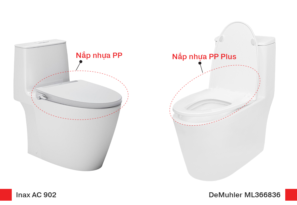 Cả 2 sản phẩm này đều sử dụng loại nắp rơi êm, có thể tháo lắp vệ sinh dễ dàng. Nếu như ở Inax là chất liệu PP thì DeMuher có phần đầu tư hơn với nắp PP Plus với ưu điểm dày dặn, mịn màng, kháng hóa chất cực tốt.