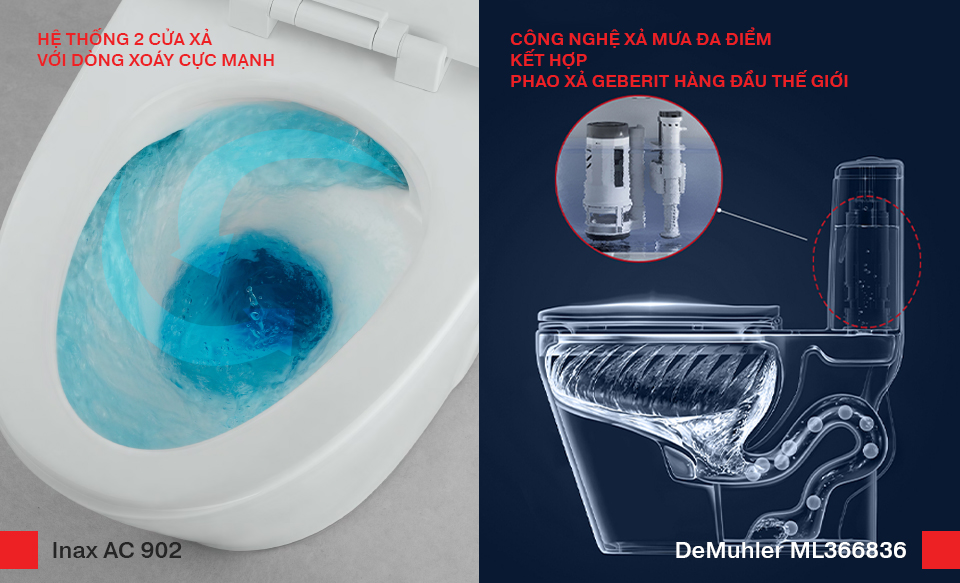Điểm khác biệt đáng chú ý giữa hai chiếc bồn cầu này nằm ở hệ thống xả. Nếu Inax AC 902 được trang bị với 2 cửa xả, bao gồm bộ cửa xả trợ lực và bộ cửa xả xoáy, để tăng sức mạnh đánh bật vết bẩn thì DeMuhler ML366836 sử dụng công nghệ xả mưa đa điểm kết hợp phao xả Geberit hàng đầu thế giới, mang lại hiệu quả xả mạnh mẽ và trơn tru, không chỉ đảm bảo lượng nước xả được phân phối đều và hiệu quả trên toàn bồn cầu mà còn đảm bảo hiệu suất lâu dài và ổn định.