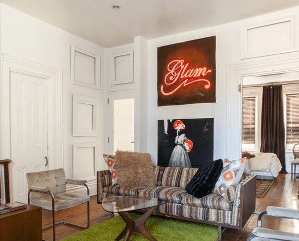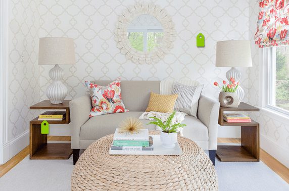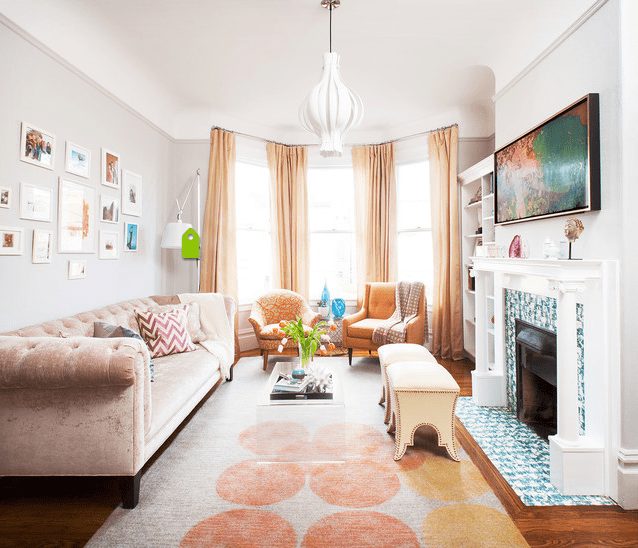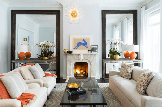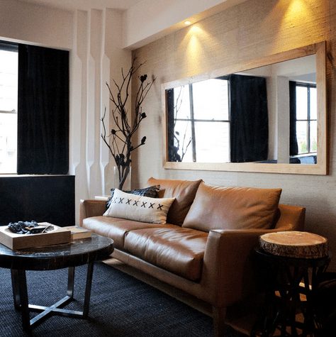 Một trong những ý tưởng phòng khách nhỏ phổ biến nhất là treo một tấm gương lớn ở vị trí trung tâm để tạo ra một tiêu điểm. Để phản chiếu ánh sáng và tạo nên một khoảng không gian lý tưởng, hãy đặt nó đằng sau nguồn sáng như đèn nến. Nếu có thể, hãy đặt một tấm gương đối diện cửa sổ của bạn để nó phản chiếu và đem đến cảm giác ảo về một chiếc cửa sổ khác.