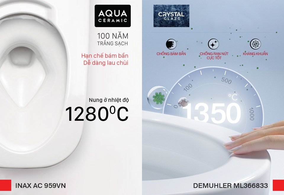 Inax AC 959VN sử dụng men Aqua Ceramic hạn chế bám bẩn và dễ lau chùi cùng cam kết 100 năm trắng sạch của nhà sản xuất. Còn DeMuhler ML366833 được trang bị men Crystal Glaze cũng thuộc top men chất lượng cao trên thị trường, được nung ở nhiệt độ 1350 độ C, giúp cho sản phẩm có độ cứng và độ bền cao, chống mài mòn, kháng khuẩn và dễ dàng lau chùi.