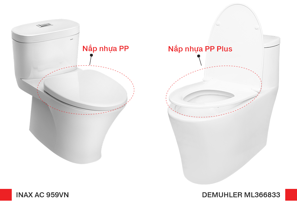Cả hai sản phẩm đều dùng nắp rơi êm. Cũng giống các mẫu chủ lực khác của hãng, Inax Inax AC 959VN vẫn trung thành với loại nắp chất liệu PP sáng bóng, rất thẩm mỹ, độ bền cao, chịu lực tốt, tuy nhiên hơi khó tháo lắp trong quá trình vệ sinh. Trong khi đó nắp DeMuhler ML366833 sử dụng chất liệu PP Plus, mang lại cảm giác cứng cáp mịn màng và cũng dễ tháo lắp hơn.