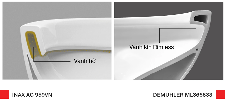 Đây là điểm khác biệt đáng chú ý của 2 mẫu bồn cầu. Dễ thấy Inax AC 959VN vẫn sử dụng thiết kế vành hở truyền thống, đây là điểm trừ lớn khi về lâu dài nó sẽ là nơi tích tụ vi khuẩn bởi rất khó để có thể thường xuyên vệ sinh kì cọ những góc khuất này.