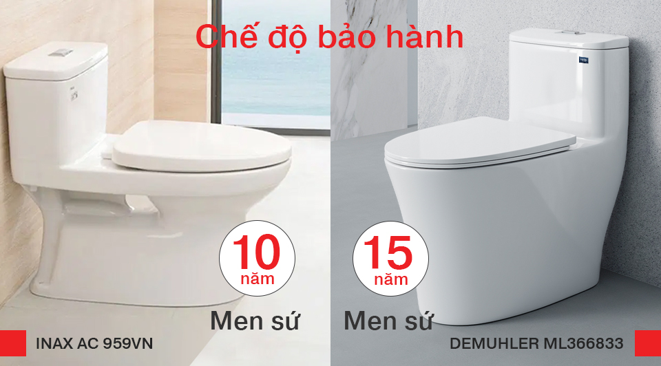 DeMuhler ML366833 vượt trội với thời gian bảo hành lên đến 15 năm cho phần sứ, 3 năm cho phao xả, và 1 năm cho phụ kiện. Trong khi đó, Inax AC 959VN cung cấp bảo hành 10 năm cho phần sứ và 1 năm cho phụ kiện.